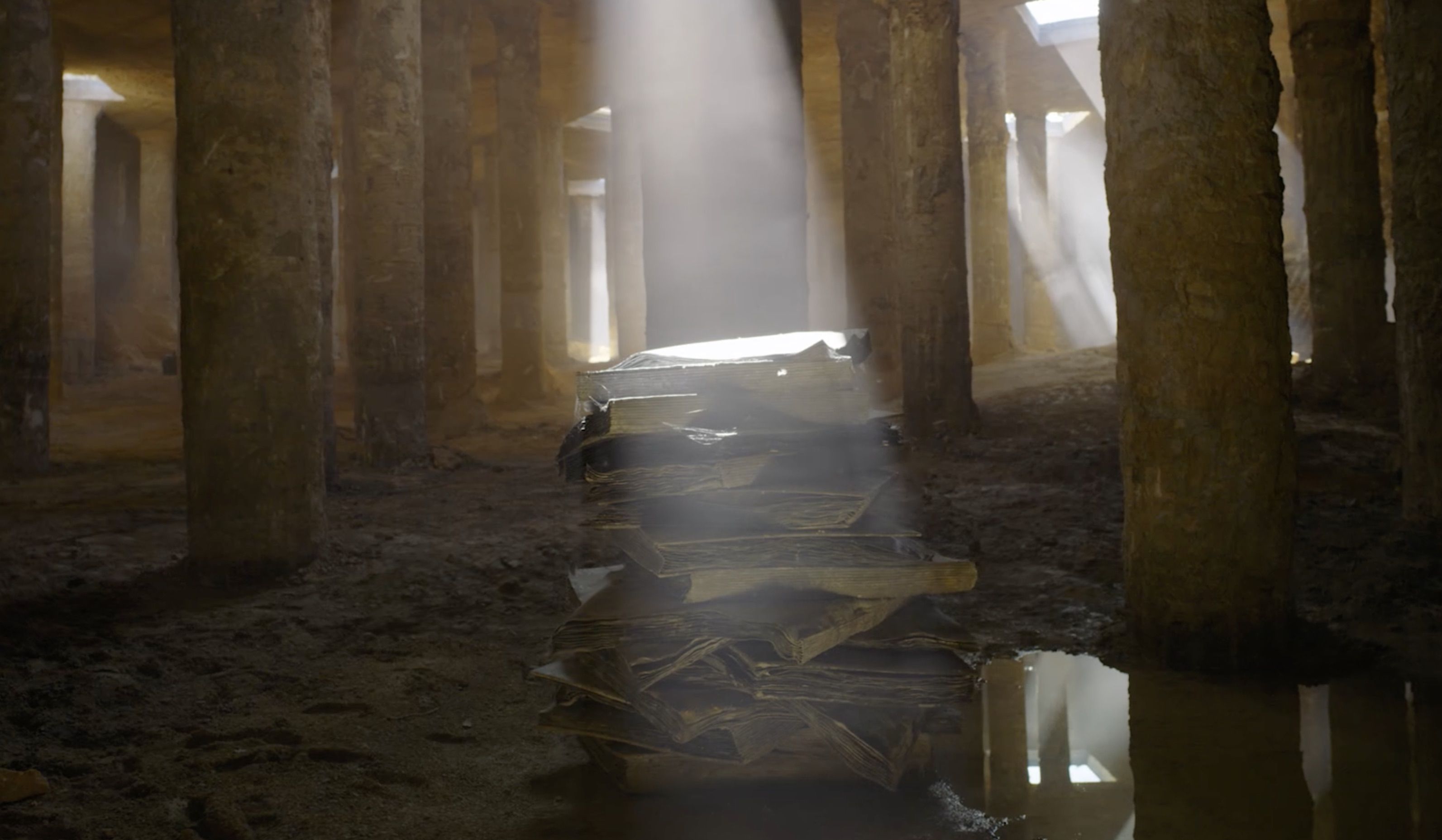 La película se tensa en esa paradoja: mostrar lo colosal subrayando lo efímero. Y es ahí en donde aparece su dimensión política, pues en los planos en que se yuxtaponen esculturas y pinturas con imágenes bélicas, resuena el eco de la enseñanza benjaminiana: la historia como catástrofe. Kiefer, en manos de Wenders, es un recolector de escombros que convierte los restos en alegorías. Como en Las mujeres de la antigüedad, de 2022, en el que un montículo de escombros dialoga con algunas imágenes de archivo y evoca el destino de las mujeres en la guerra, el filme rehúye el comentario directo, limitándose a la reverberación de voces, a los ecos de los textos inscritos, a la música de Leonard Küßner, y deja que el espectador confronte por sí mismo las ruinas expuestas.