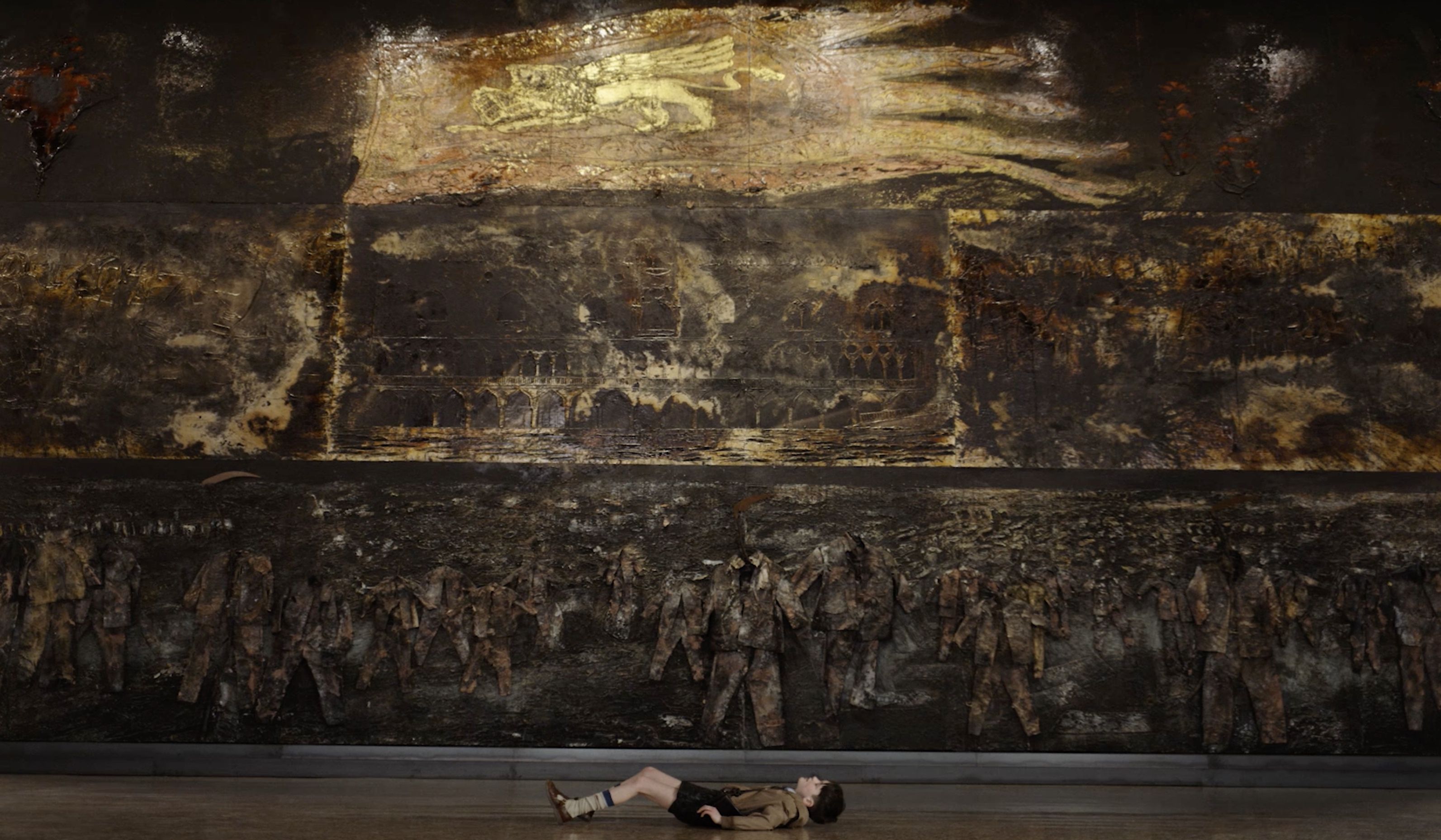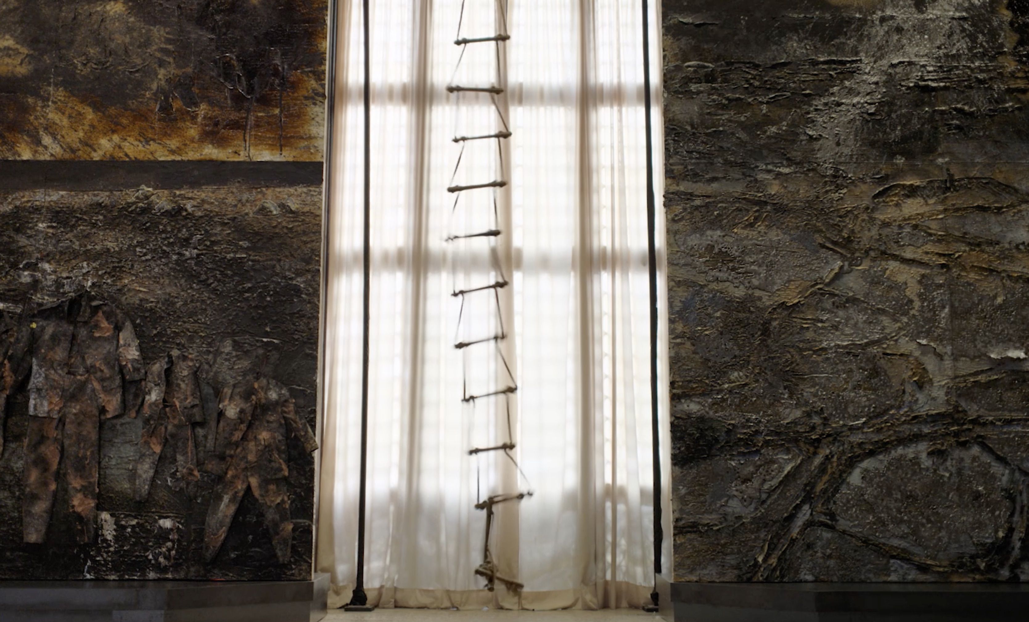 Ese universo fue trasladado al cine por Wim Wenders en Anselm: el susurro del tiempo, de 2023. La tridimensionalidad de la obra de Kiefer se despliega en la pantalla como experiencia inmersiva, en continuidad con lo que el cineasta había ensayado en Pina. En esta ocasión, las cámaras en 6K y 3D no son artificios, sino una vía para palpar la densidad de las superficies: sus grietas, sus texturas y sus heridas. Las imágenes de Wenders confirman que Kiefer no solo pinta o esculpe, sino que libra una batalla contra la historia y contra el olvido. Sus obras son actos performativos donde la materia se resiste, se desgarra y se consume. Esa monumentalidad no es triunfo, sino precariedad: las torres pueden desplomarse, los muros desmoronarse, las cenizas deshacerse entre los dedos. La fragilidad se inscribe en la obra como recordatorio de que ninguna narrativa histórica es definitiva, de que la memoria siempre se agrieta.