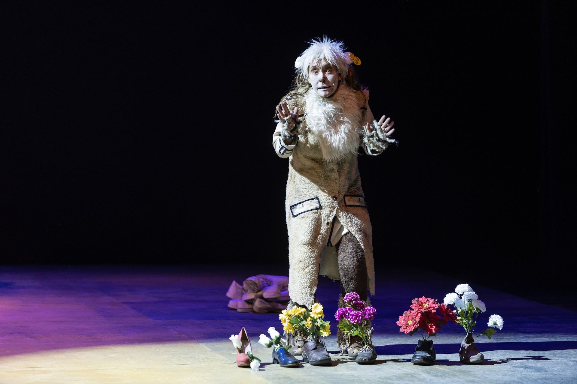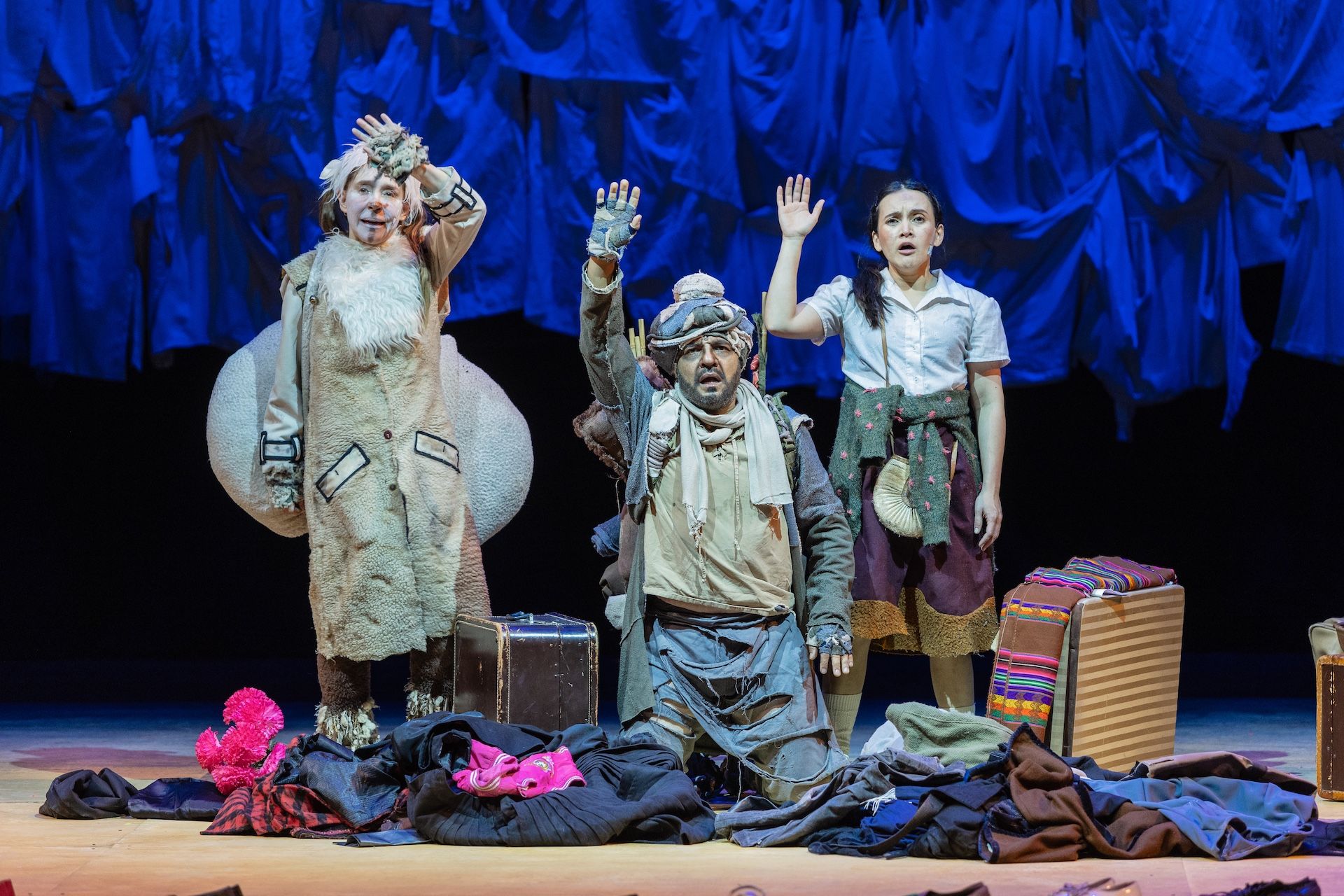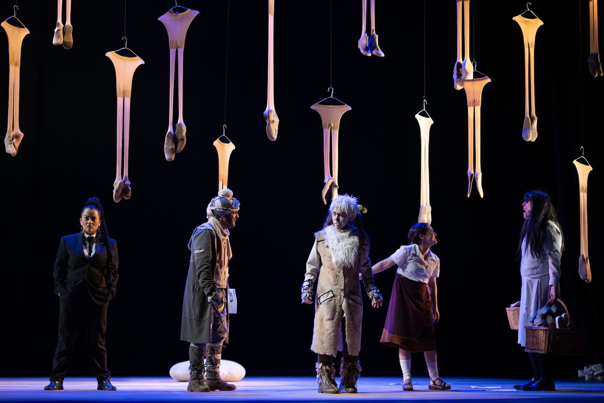 Ropa acumulada en tendederos gigantes, caminos de zapatos vacíos, medias colgando del techo —metáfora de cuerpos cuyas vidas han sido interrumpidas— son la forma con la que Teatro Petra elige representar a los habitantes de Santo José que decidieron o tuvieron que quedarse y perecieron. Las prendas vacías inundan el escenario como restos de piel, vestigios de un cuerpo deshecho, convirtiéndose en memorial y epitafio al mismo tiempo. Encarnan lo que queda cuando la vida sólo sobrevive en la memoria de alguien más. En tal elección estética se erige una poética de la ausencia, una afirmación de que la violencia no sólo mata cuerpos, también los lugares que los contenían.